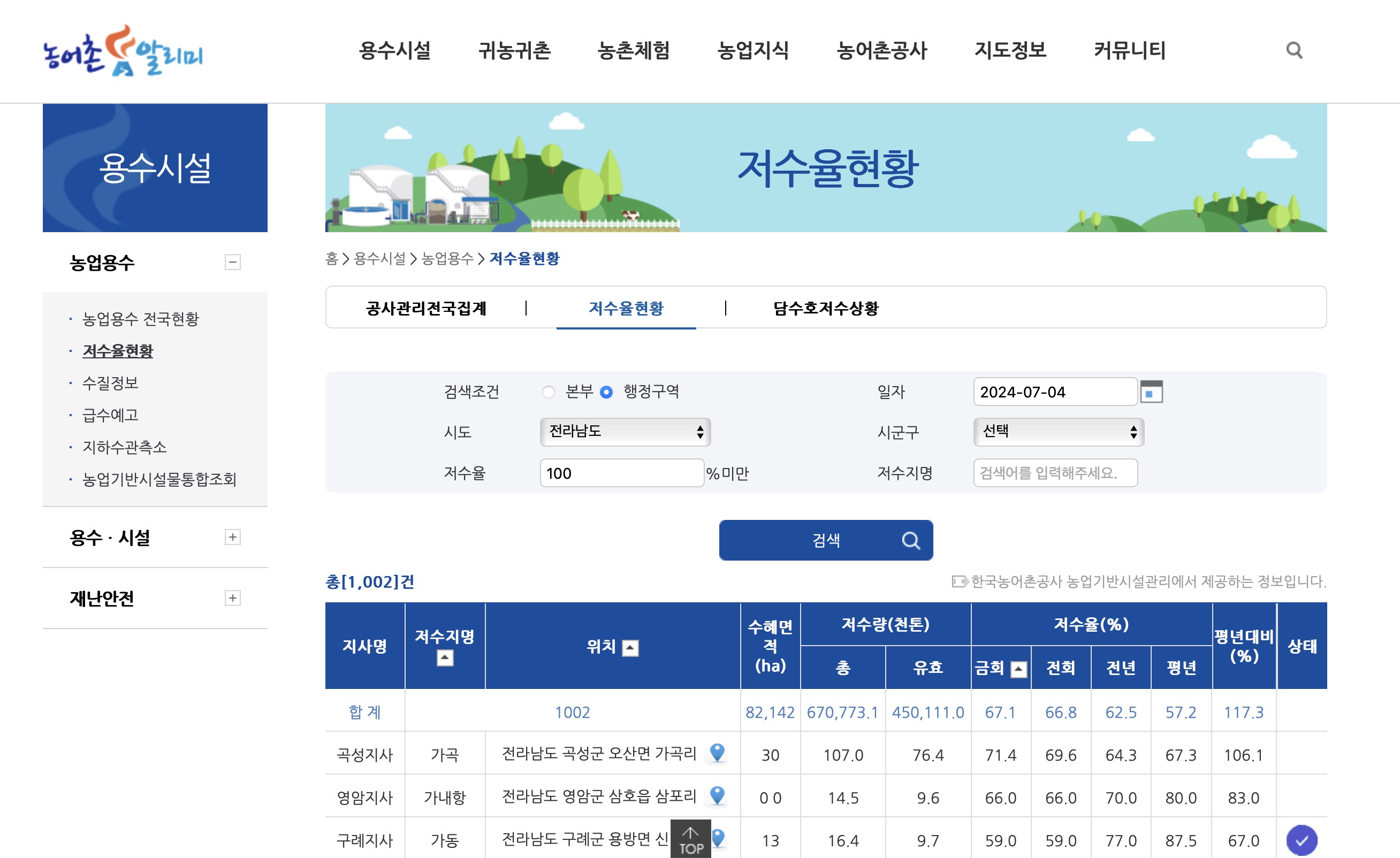 - '저수지 저수율' 메뉴를 클릭하여 전국 저수지의 저수율 현황 페이지로 이동합니다.