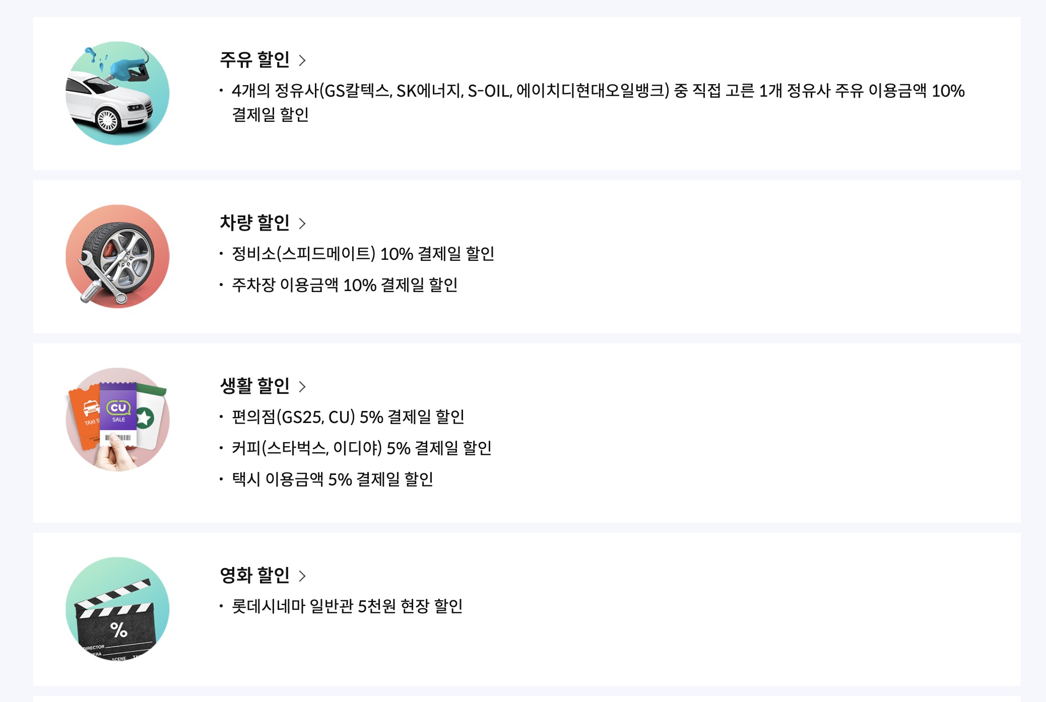 - 주유 할인: 월 1만 5천 원 (결제금액 15만 원까지 적용)