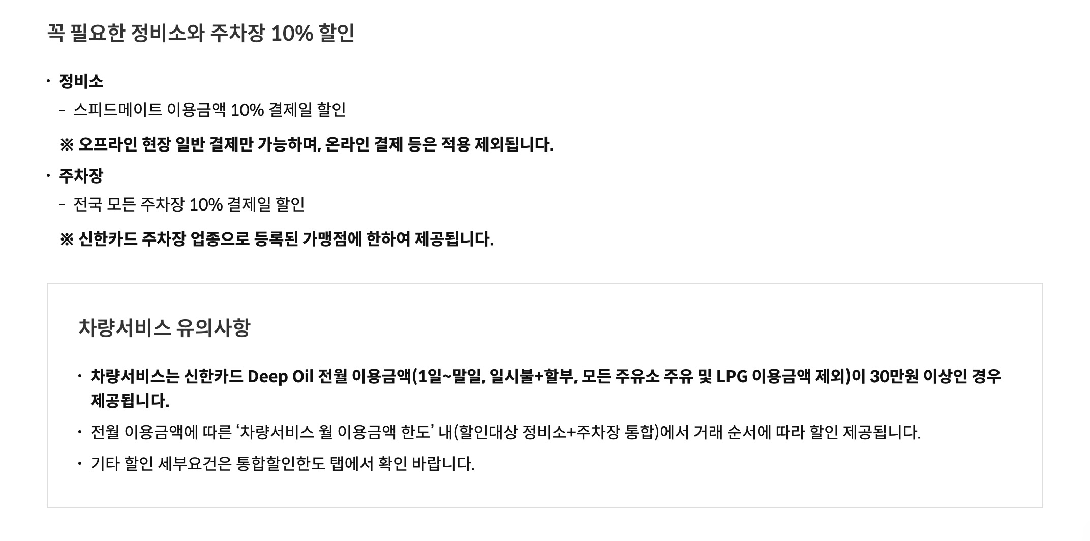 - 주차장: 신한카드에 등록된 전국 주차장에서 10% 할인
